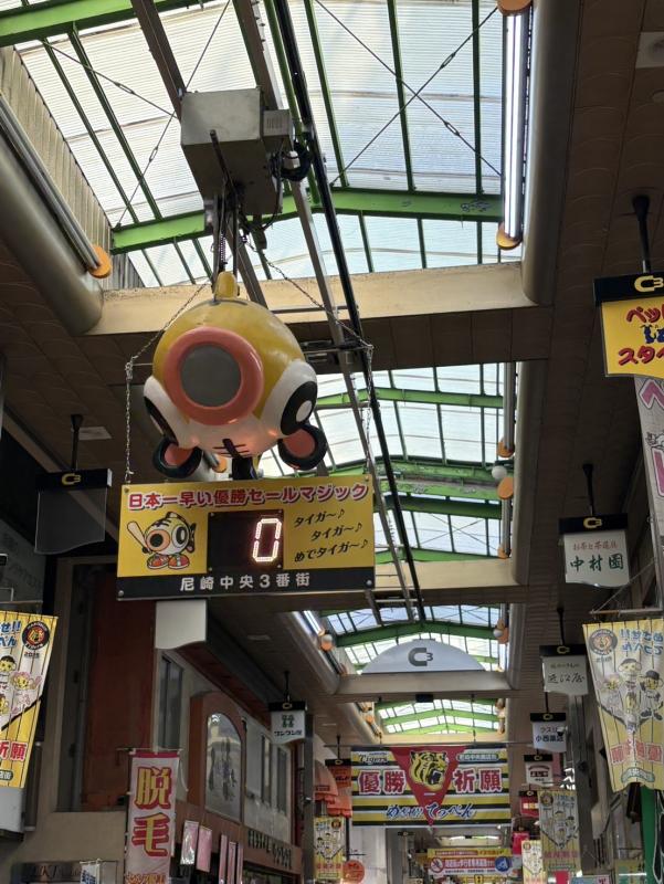 阪神タイガースの2年ぶりのセ・リーグ優勝、本当におめでとうございます! 地元・阪神南地域でも歓喜の輪が広がっています。「日本一早いマジック点灯」で有名な尼崎中央三丁目商店街では、優勝の翌日、「マジック」の掲示板が「0」に変わるイベントが開催され、阪神電鉄の鳴尾・武庫川大学前駅では選手の等身大パネルが登場するなど、地元ならではの盛り上がりです。 マジック「0」の電光掲示板 鳴尾・武庫川女子大前駅に設置された選手の等身大パネル 期間限定タイガースカラーの甲子園駅名看板