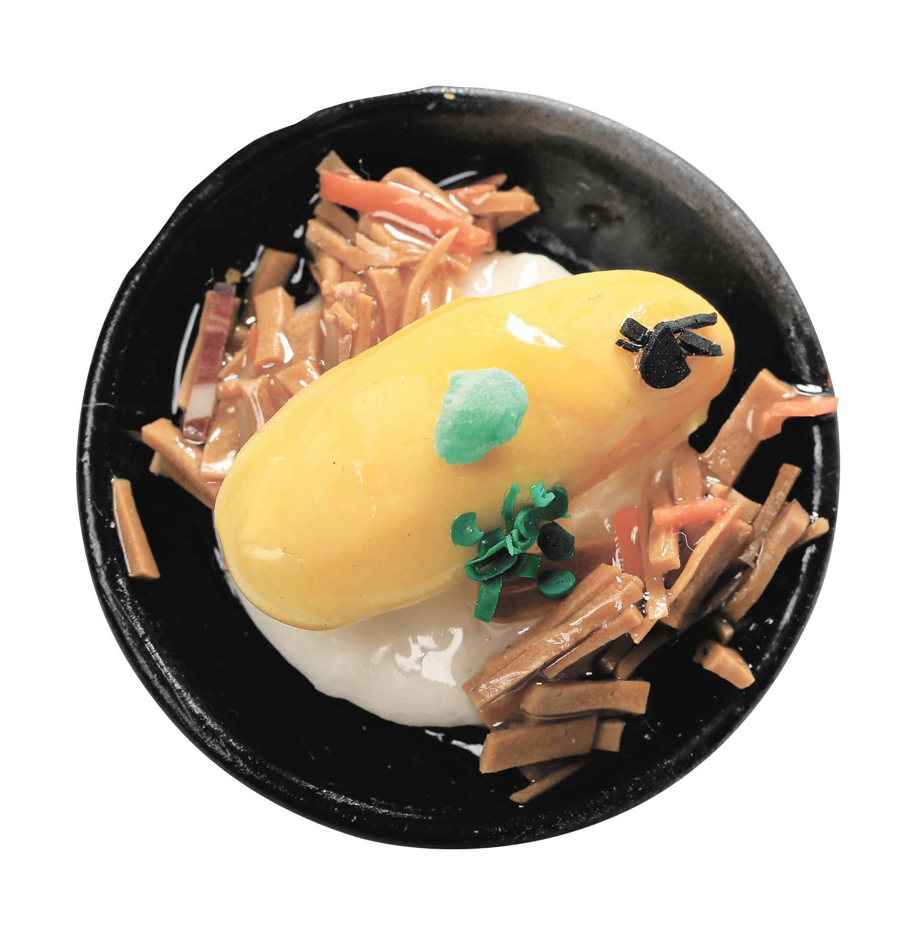 丼のミニチュアは3種類。ストラップとピンバッジの2タイプあります。)