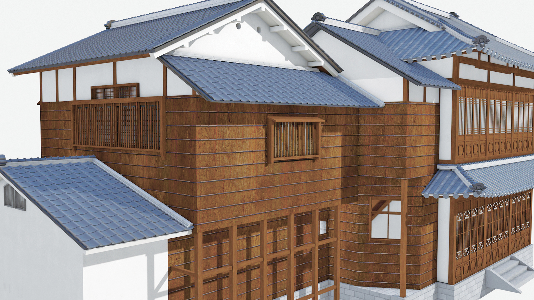 VR映像(北西から見た外観)。奥から客間棟、階段棟、書斎棟。書斎棟の手前には出入り口のある平屋の小部屋も。画像提供:NPO法人潤
