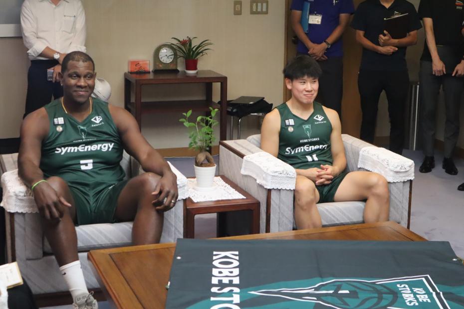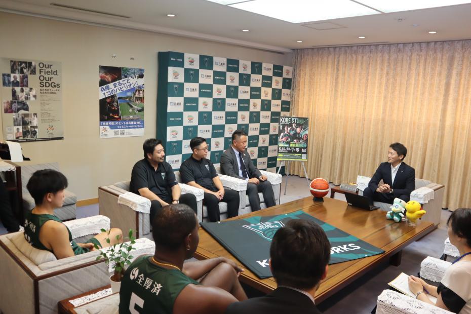 齋藤知事は「今シーズンはGLION ARENA KOBEを本拠地として迎える初めての本格的なシーズンになる。多くの子ども、県民の方に素晴らしいプレーを見せていただき、B2優勝を果たしてほしい」と述べました。