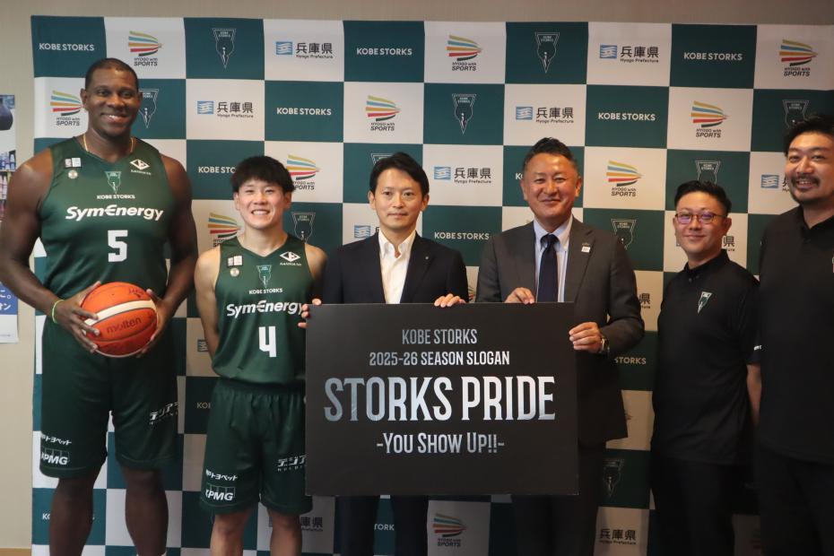 神戸ストークスの渋谷順代表取締役社長、九里大和ゼネラルマネージャー、川辺泰三ヘッドコーチ、ダブルキャプテンの寺園脩斗選手、アイザック・バッツ選手が、2025-26シーズンスタートへの抱負および活動報告のため、齋藤元彦知事を表敬訪問しました。