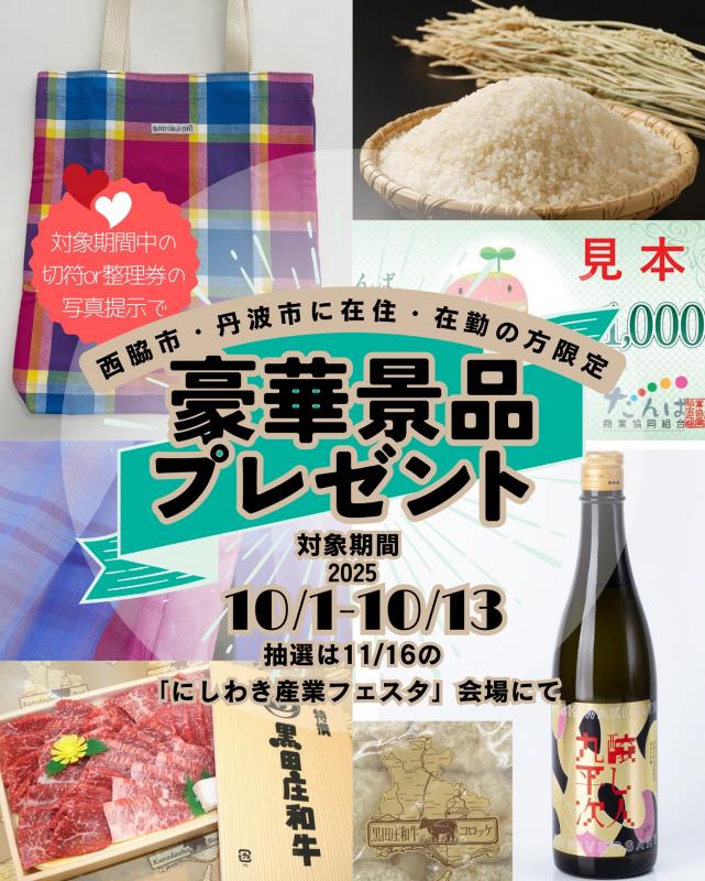 10月1日(水曜日)~10月13日(月曜日・祝日)の期間で、JR加古川線(西脇市駅~谷川駅)に乗車された方に抽選で豪華プレゼントが当たります。